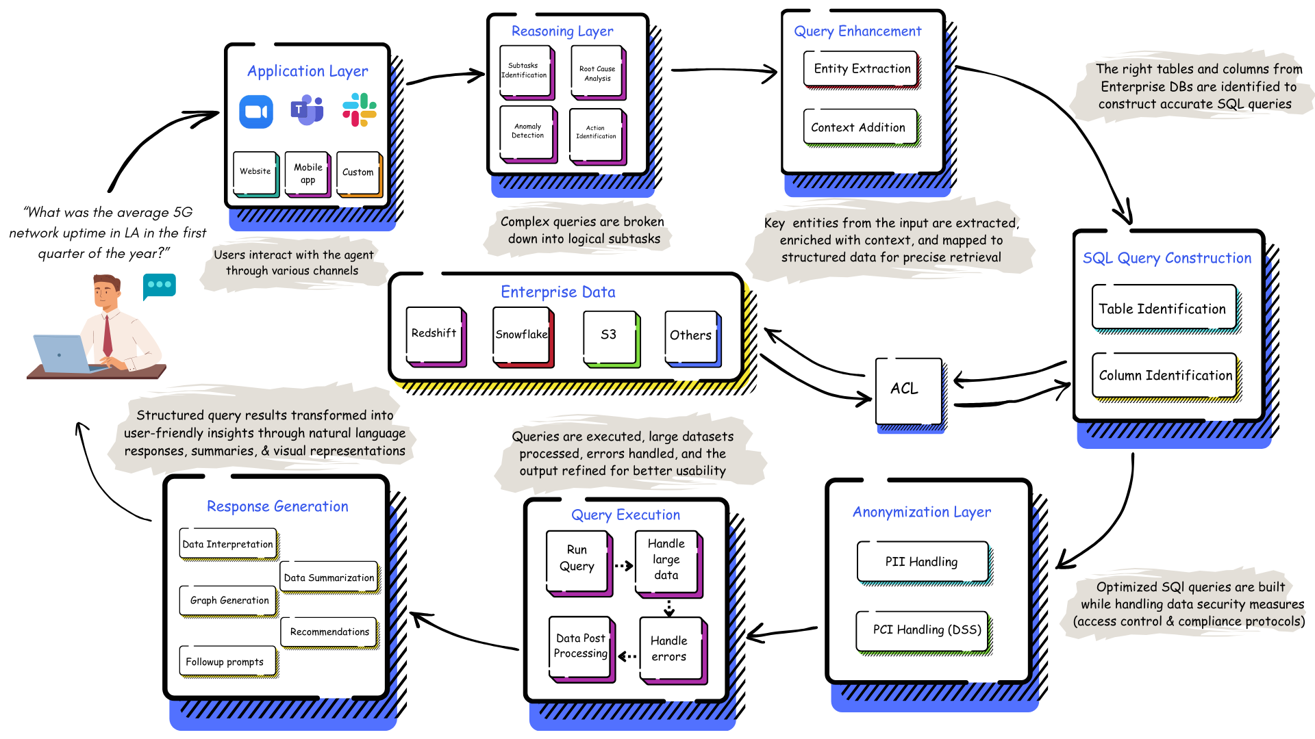 Through seamless enterprise integration, the agent connects with your data warehouses, data lakes, and BI tools. It creates an intelligence layer over your data infrastructure, unlocking real-time access to your tech stack. It enables source system ACL and strict role-based data access.