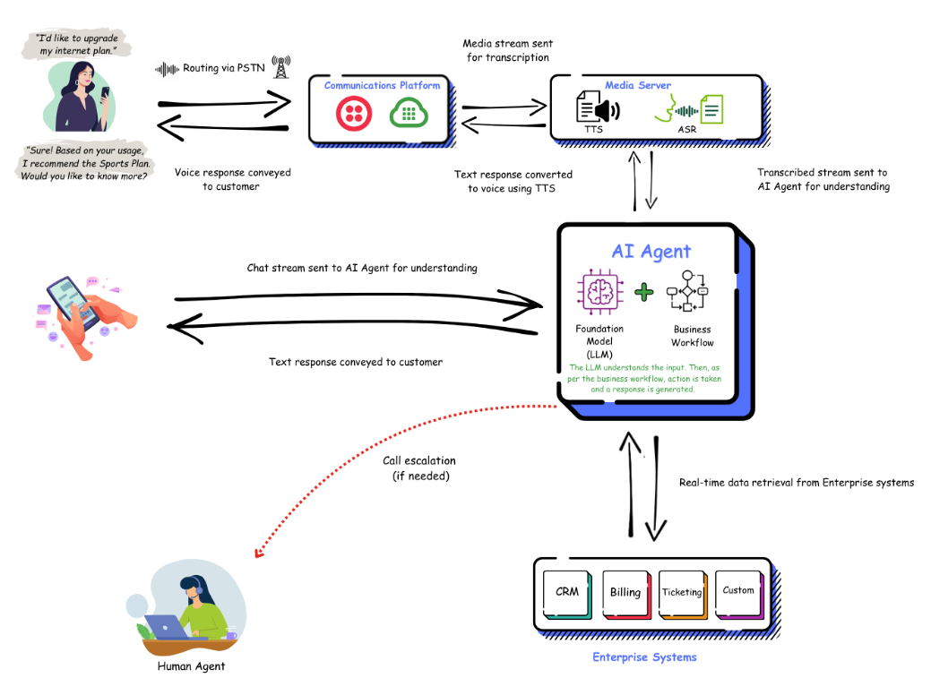 Integrate with your enterprise systems, create tickets automatically, and transfer to live agents when needed.